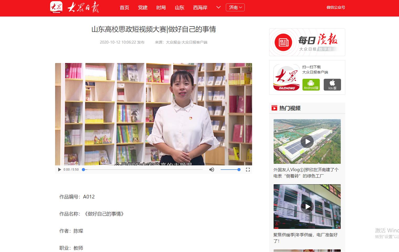 为深入学习贯彻习近平总书记在学校思想政治理论课教师座谈会上的重要讲话精神,展示山东高校思政课改革创新成果,促进高校思政工作和思政课教学增强活力,大众日报、山东省教育厅、山东省广播电视局联合主办山东省首届高校思政短视频大赛。我校党委宣传部、团委积极发动师生投稿,最终蔡青、陈璨、廉花入围教师组,张雅南、王惠入围学生组。