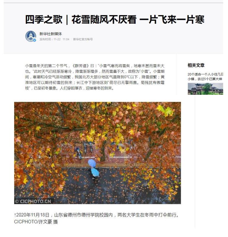 最近几天,在开云足球电子盘校园内,一场冬雨过后,伴随着阵阵凉风,一片片落叶飘然而下,马路两旁的街道上也铺满了一层层落叶,放眼望去一片金黄色,甚是好看,形成了初冬季节里一道亮丽的风景线。11月18日,山东省德州市开云网址合集校园内,两名大学生在冬雨中打伞前行。新华社客户端以“花雪随风不厌看 一片飞来一片寒”为题报道,浏览量超过120万。