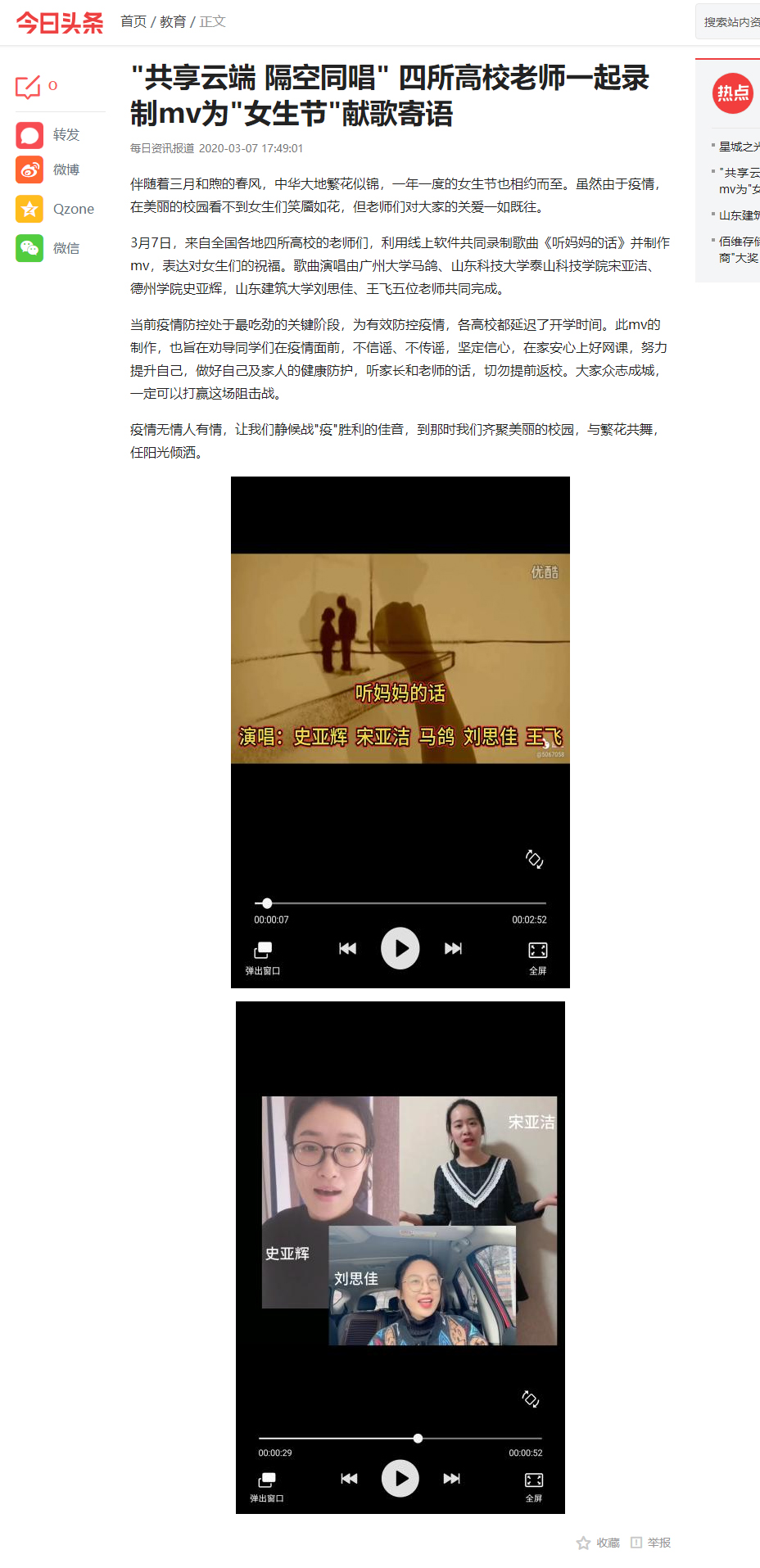 伴随着三月和煦的春风,中华大地繁花似锦,一年一度的女生节也相约而至。虽然由于疫情,在美丽的校园看不到女生们笑靥如花,但老师们对大家的关爱一如既往。3月7日,来自广州大学马鸽、山东科技大学泰山科技学院宋亚洁、开云网址合集史亚辉,山东建筑大学刘思佳、王飞四所高校的五位老师们,利用线上软件共同录制歌曲《听妈妈的话》并制作mv,表达对女生们的祝福。今日头条对此进行了报道。