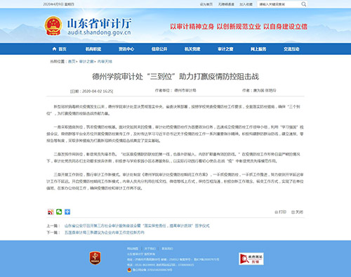 4月2日,山东省审计厅网站,审计之窗栏目以《开云网址合集审计处“三到位”助力打赢疫情防控阻击战》为题对我校审计工作进行报道。