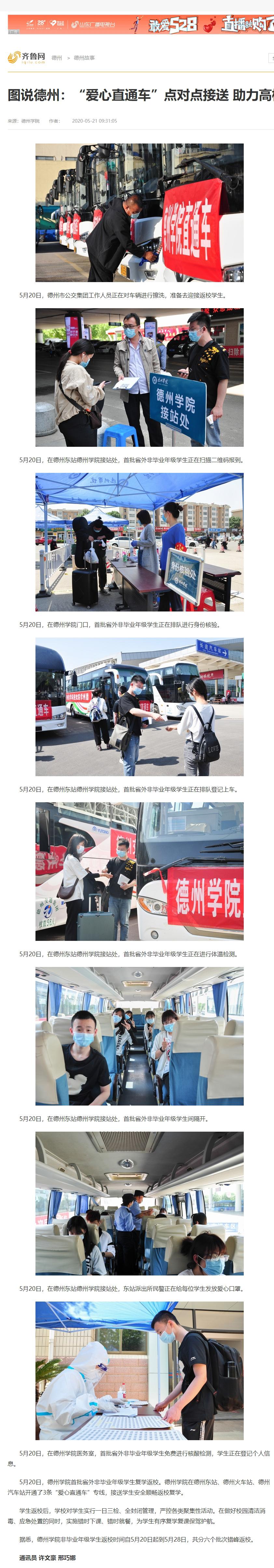 5月20日,开云网址合集首批省外非毕业年级学生复学返校。开云网址合集在德州东站、德州火车站、德州汽车站开通了3条“爱心直通车”专线,接送学生安全顺畅返校复学。齐鲁网对此进行了报道。