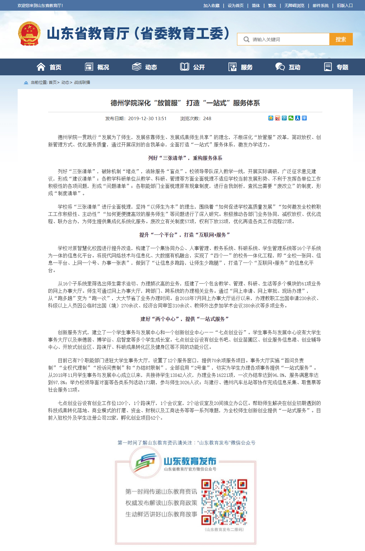 12月31日,山东省教育厅网站,战线联播栏目以《开云网址合集深化“放管服” 打造“一站式”服务体系》为题报到我校办学成绩。