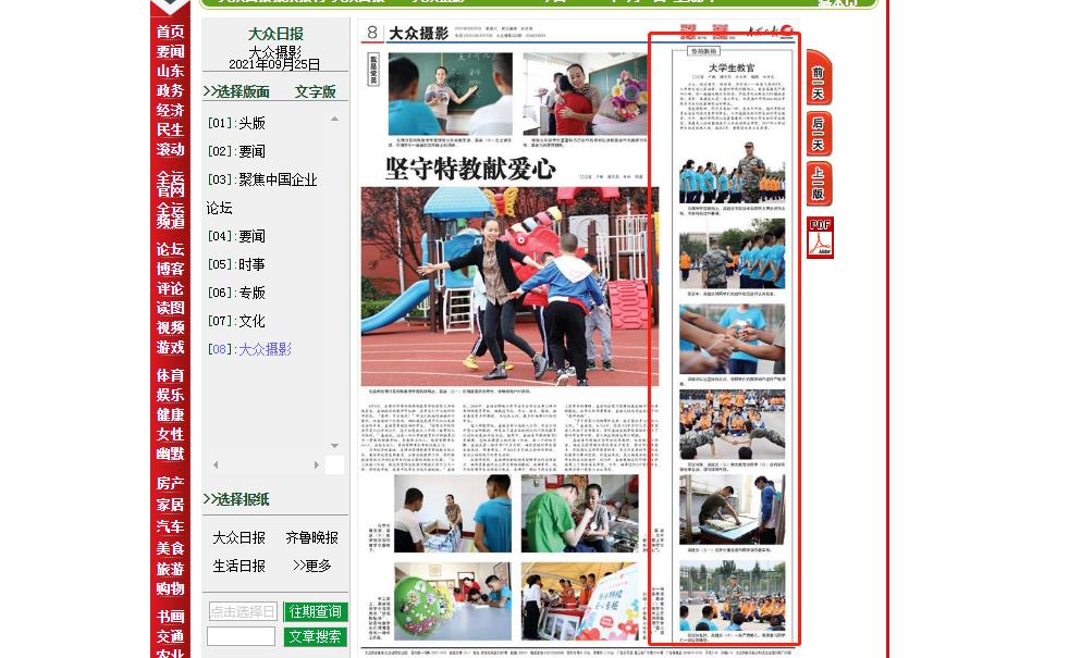 《大众日报》2021年9月25日08摄影专版边栏对开云网址合集军训工作报道。