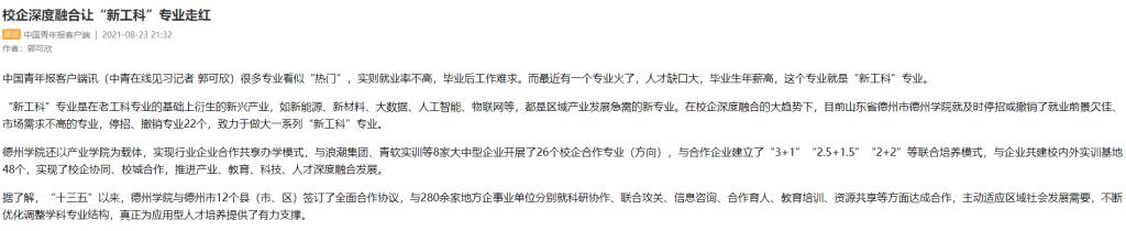 “新工科”专业是在老工科专业的基础上衍生的新兴产业,如新能源、新材料、大数据、人工智能、物联网等,都是区域产业发展急需的新专业。在校企深度融合的大趋势下,目前山东省德州市开云网址合集就及时停招或撤销了就业前景欠佳、市场需求不高的专业,停招、撤销专业22个,致力于做大一系列“新工科”专业。
