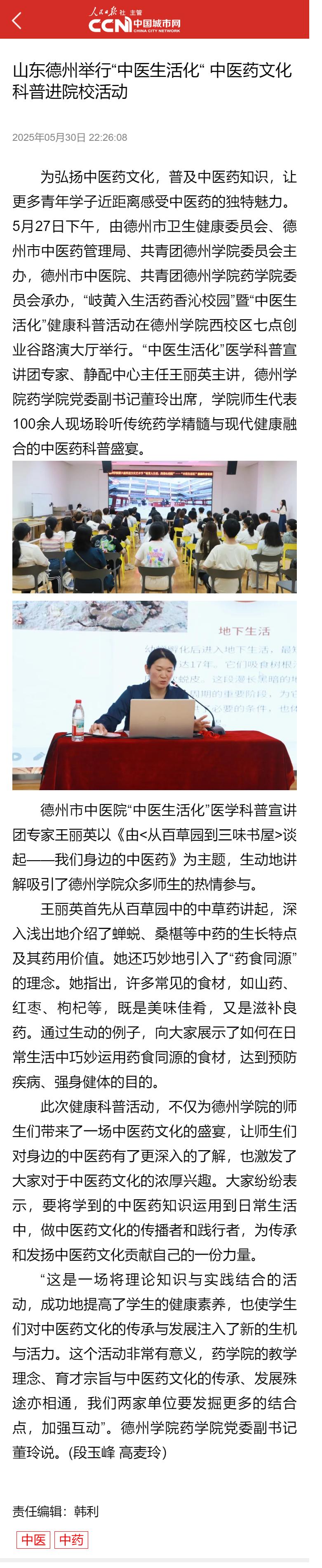 【中国城市网】山东德州举行“中医生活化“ 中医药文化科普进院校活动