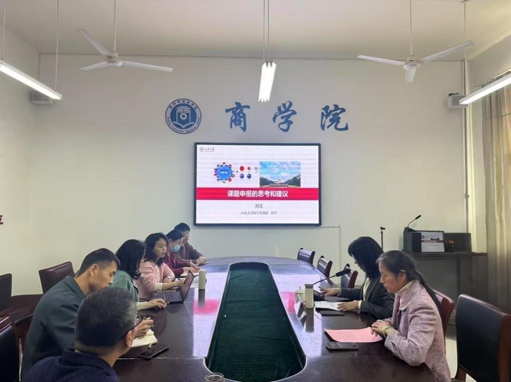 国家社科基金重大项目评审专家、山东大学博士生导师刘文教授于3月14日应邀莅临商学院开展国家级课题申报指导。在明理楼0359会议室,刘教授以"国家级社科基金申报策略与经验分享"为主题作专题学术报告,并对教育部社科基金申请书进行一对一指导。商学院院长主要负责人及30余名骨干教师参加活动。