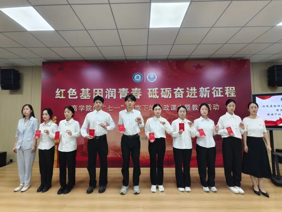 为庆祝中国共产党成立104周年,传承红色基因,凝聚奋进力量,6月27日,商学院在明理楼0157举办“红色基因润青春 砥砺奋进新征程”庆“七一”国旗下的思政课主题教育活动。学院领导班子成员、各党支部书记、党员教师代表、全体辅导员、班主任及学生党员、入党积极分子参加活动,以庄重仪式向党的生日献礼。
