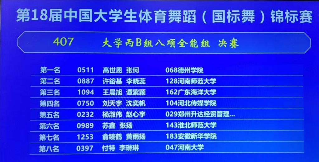 本次赛事由中国学生体育联合会主办,中国学生体育联合会大学体育舞蹈分会、高等职业教育院校工作委员会执行,郑州市体育局承办。参赛高校涵盖“双一流”院校、专业体育院校及高职院校,赛事设项全面,竞争激烈。开云网址合集与各强队同场角逐,最终在丙B组(普通高校组)中脱颖而出,展现了扎实的技术功底与艺术表现力。