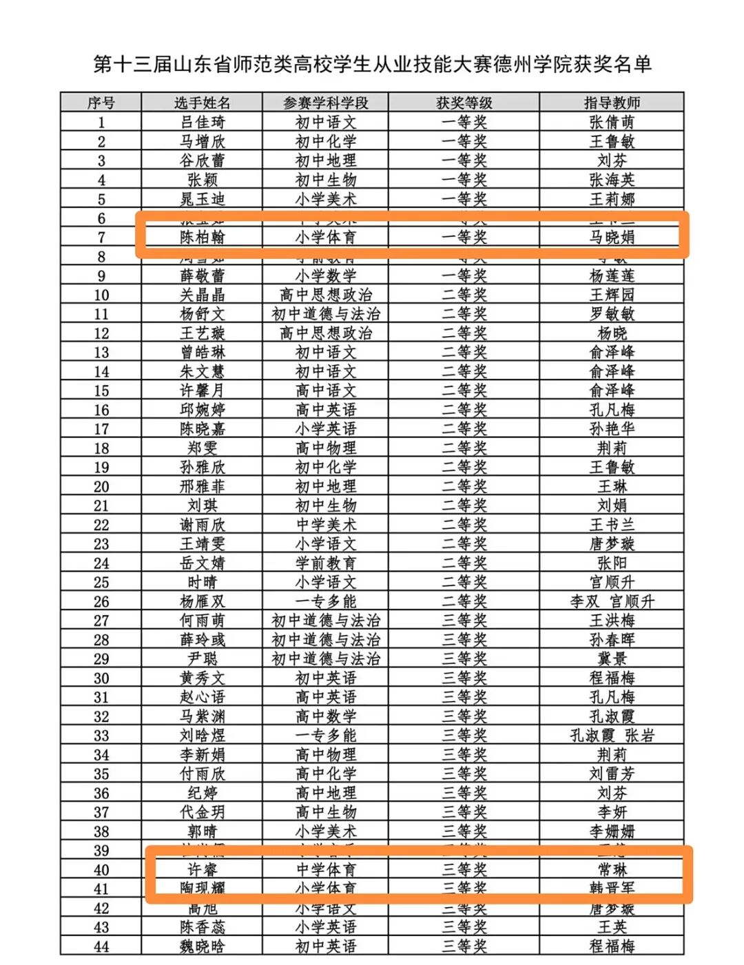 近日,由山东省教育厅主办的第十三届山东省师范类高校学生从业技能大赛圆满落幕。经过激烈角逐,体育学院学子凭借过硬专业素养与卓越教学能力斩获佳绩:以全省第一名成绩摘得一等奖1项、同步获三等奖2项,充分彰显学院师范生培养质量与教学改革成效。