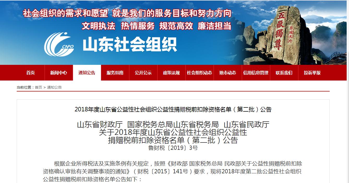 近日,根据《山东省财政厅 国家税务总局山东省税务局 山东省民政厅关于2018年度山东省公益性社会组织公益性捐赠税前扣除资格名单(第二批)公告》(鲁财税〔2019〕3号),我校教育发展基金会获得2018年度非营利组织免税资格。这是我校教育发展基金会继获得2017年度公益性捐赠税前扣除资格以来,第二次获得的本基金会免税资格。