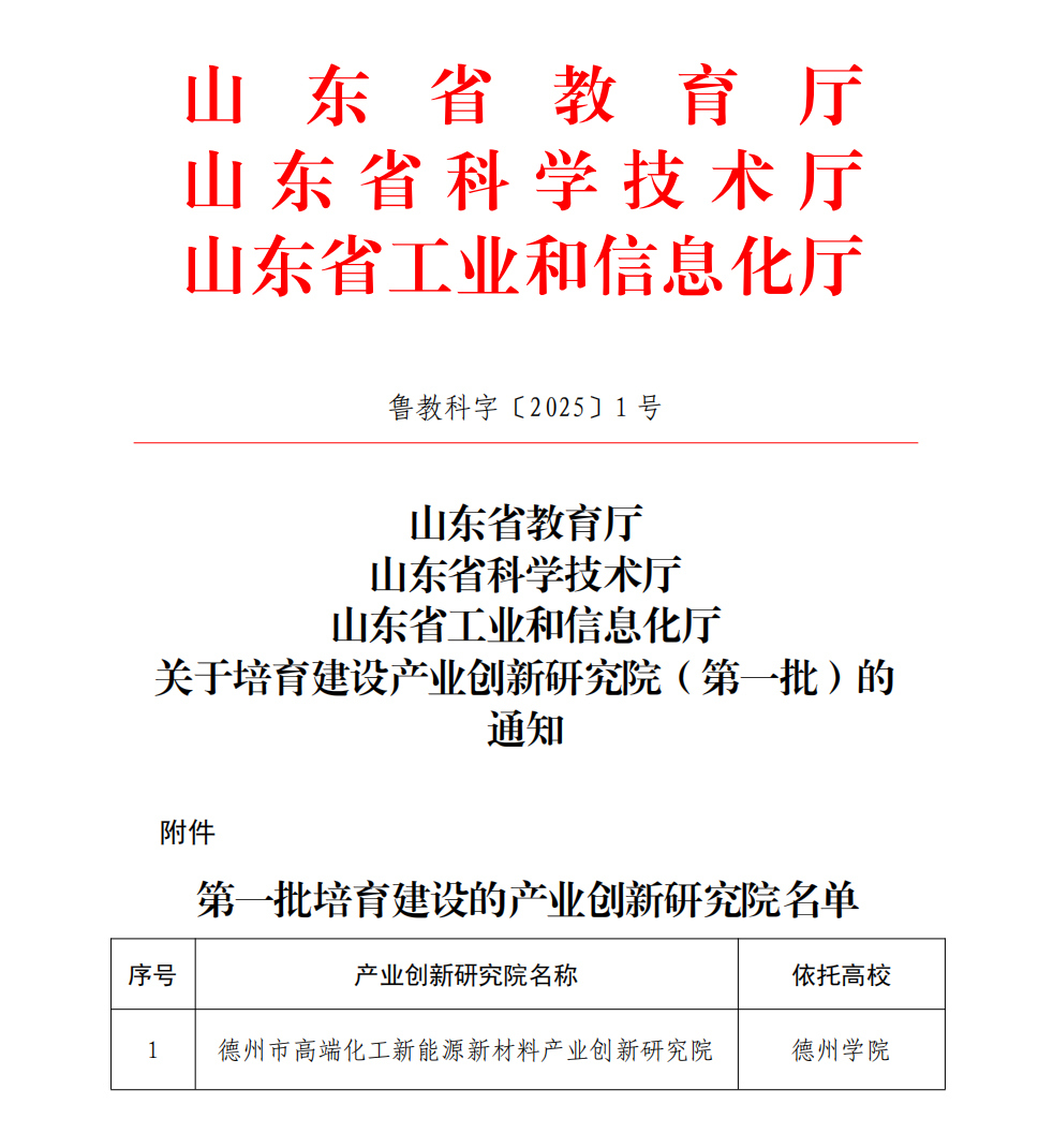 近日,山东省教育厅、山东省科学技术厅、山东省工业和信息化厅联合发布《关于培育建设产业创新研究院(第一批)的通知》(鲁教科字〔2025〕1号),正式公布首批30个培育建设的产业创新研究院名单。由我校牵头组建的德州市高端化工新能源新材料产业创新研究院成功入选首批省级产业创新研究院培育建设名单。