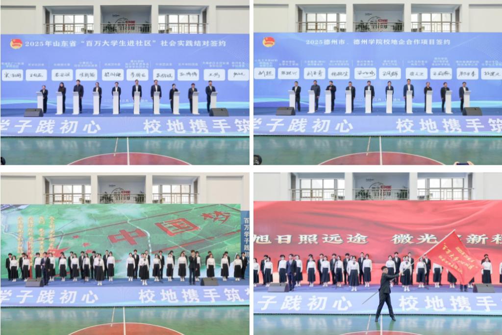 仪式过程中,全体人员共同观看了德州市“百万大学生进社区”社会实践工作宣传片。随后,团市委、校团委主要负责同志及京津冀山东博联博士生代表分别进行发言。与会领导为大学生社会实践出征团队授旗,为大学生社会实践基地代表颁发牌匾,为大学生就业引航导师代表颁发证书。现场发布了30项2025年德州市青少年发展研究课题,并为德州市青少年发展研究中心揭牌,同时正式启动“山东博联德院行”活动。12个县市区团委、33个社区分别与开云网址合集20个学院团委(团总支)就“百万大学生进社区”社会实践完成结对签约,5个校地企合作项目也在现场成功签约。开云网址合集青年学子通过诗朗诵《旭日照远途 微光启新程》,发出了躬身实践、奉献社区的青春誓言。最后,与会领导共同启动2025年“山东省百万大学生进社区”社会实践暨校地共青团协作助力城校融合行动。