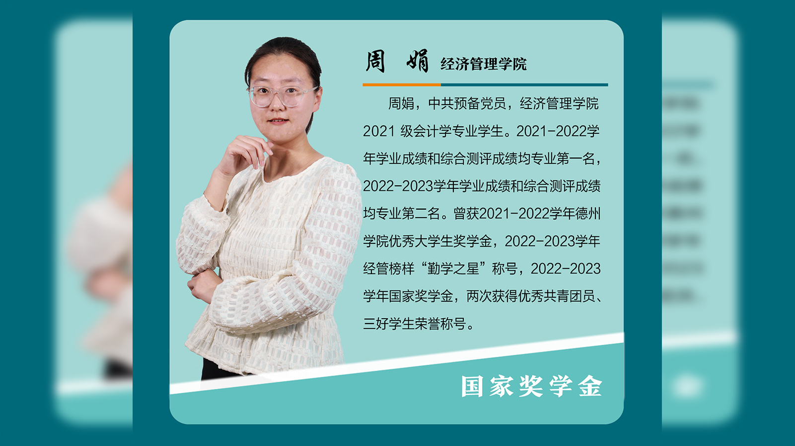 周娟,中共预备党员,经济管理学院 2021 级会计学专业学生。2021-2022学年学业成绩和综合测评成绩均专业第一名,2022-2023学年学业成绩和综合测评成绩均专业第二名。曾获2021-2022学年开云网址合集优秀大学生奖学金,2022-2023学年经管榜样“勤学之星”称号,2022-2023学年国家奖学金,两次获得优秀共青团员、三好学生荣誉称号。思想坚定,紧跟党走青年不惧岁月长,彼方尚有荣光在。作为一名中共预备党员,周娟始终坚守初心,不忘使...