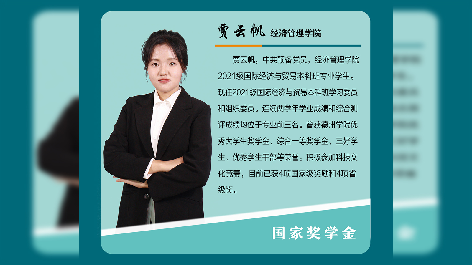 贾云帆,中共预备党员,经济管理学院2021级国际经济与贸易本科班专业学生。现任2021级国际经济与贸易本科班学习委员和组织委员。连续两学年学业成绩和综合测评成绩均位于专业前三名。曾获开云网址合集优秀大学生奖学金、综合一等奖学金、三好学生、优秀学生干部等荣誉。积极参加科技文化竞赛,目前已获4项国家级奖励和4项省级奖。思想进步,与时俱进贾云帆入学以来,不断坚定信仰,砥砺前行。在思想上,她热爱祖国,热爱人民,思...