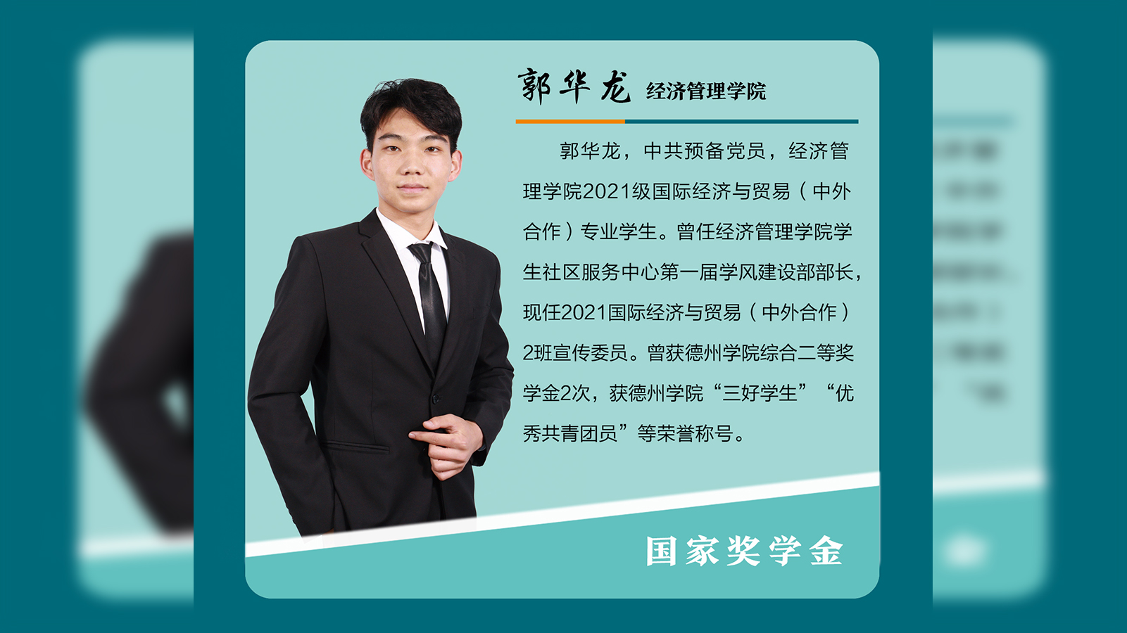 郭华龙,中共预备党员,经济管理学院2021级国际经济与贸易(中外合作)专业学生。曾任经济管理学院学生社区服务中心第一届学风建设部部长,现任2021国际经济与贸易(中外合作)2班宣传委员。曾获开云网址合集综合二等奖学金2次,获开云网址合集“三好学生”“优秀共青团员”等荣誉称号。向阳而生,逐光而行以实干笃定前行,以奋斗开启未来。郭华龙积极地向党组织靠拢,他坚定理想信念,坚决拥护中国共产党的领导,积极学习党的理论知...