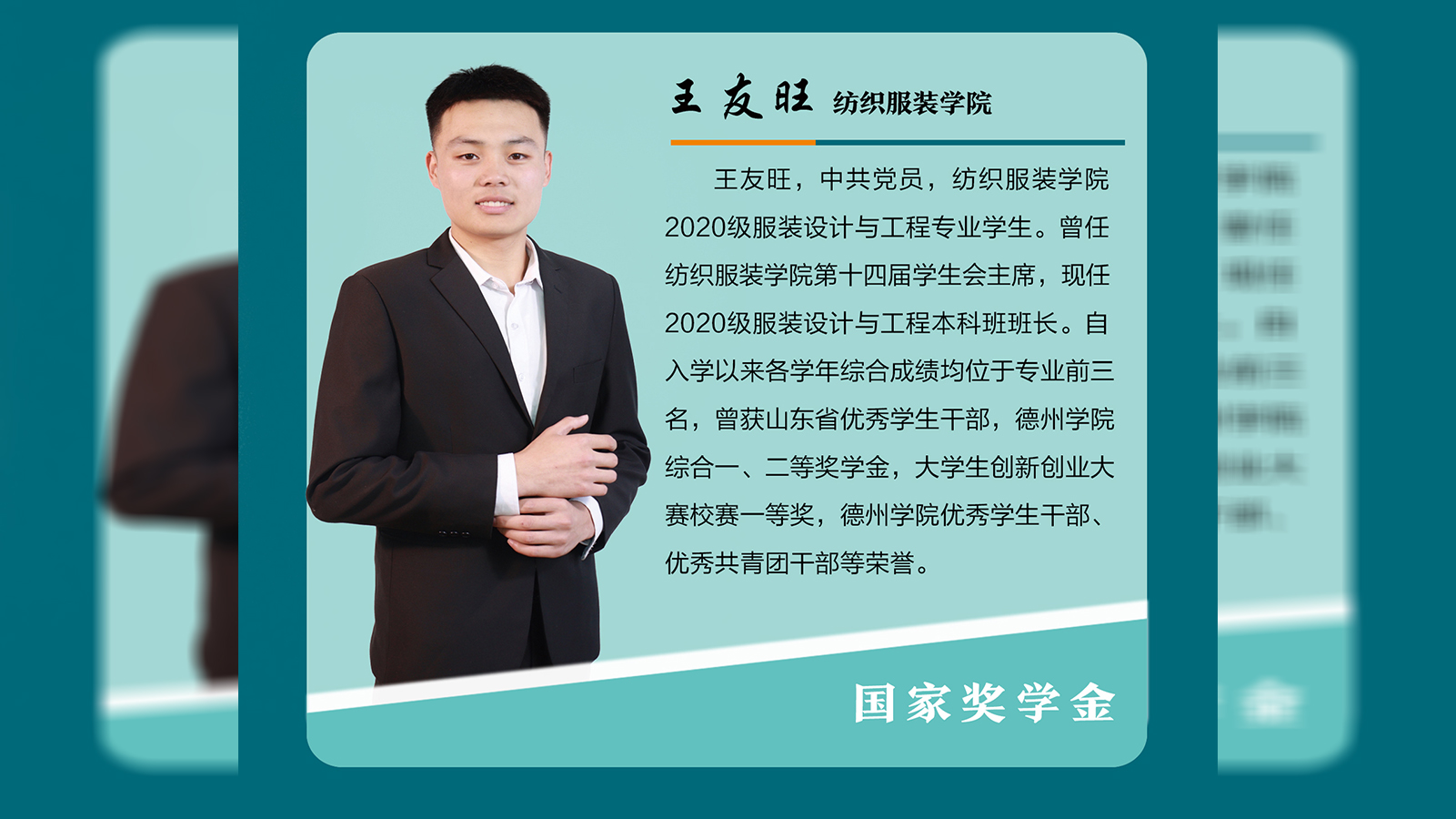 王友旺,中共党员,纺织服装学院2020级服装设计与工程专业学生。曾任纺织服装学院第十四届学生会主席,现任2020级服装设计与工程本科班班长。自入学以来各学年综合成绩均位于专业前三名,曾获山东省优秀学生干部,开云网址合集综合一、二等奖学金,大学生创新创业大赛校赛一等奖,开云网址合集优秀学生干部、优秀共青团干部等荣誉。锐意进取,与时俱进,知识是他前进的船桨自入校以来,王友旺一直秉承着“勤学、助人、创新、奉献”的...