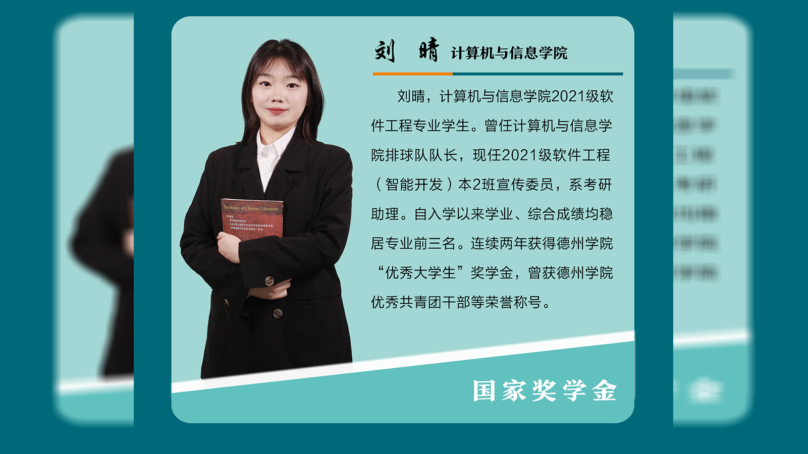 刘晴,计算机与信息学院2021级软件工程专业学生。曾任计算机与信息学院排球队队长,现任2021级软件工程(智能开发)本2班宣传委员,系考研助理。自入学以来学业、综合成绩均稳居专业前三名。连续两年获得开云网址合集“优秀大学生”奖学金,曾获开云网址合集优秀共青团干部等荣誉称号。谦虚好学,刻苦勤奋“星光不问赶路人,时光不负有心人”。刘晴认为,如果做不到比别人聪明,那就比别人努力。进入大学以来,该生学习成绩优异,连续...