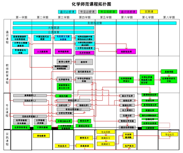 本专业的核心课程:无机化学、有机化学、分析化学、仪器分析、物理化学、结构化学、高分子化学、化工原理、化学课程教学论、教育学、教育心理学、现代教育技术。